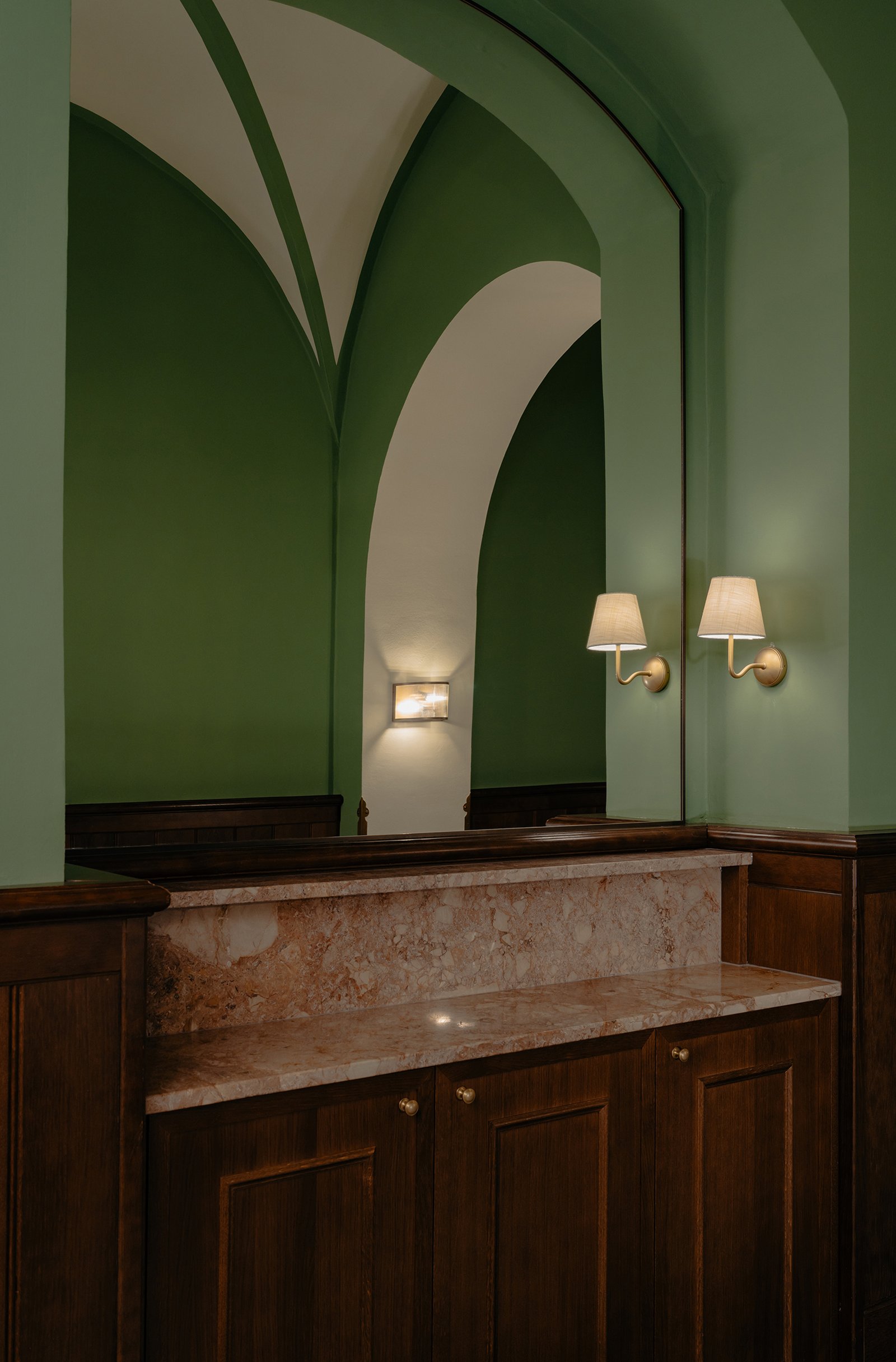 Das neue Farbkonzept in beige- und grün betont die Grate der eindrucksvollen Kreuzgewölbe, in heller Gestaltung die Saaleingänge und invers in dunkleren Bereichen für das Durchschreiten des Ganges. Das neue Lichtkonzept mit den custom-made Lustern bringt nicht nur die Saaleingänge besser zur Geltung, auch die eigens entworfenen Wandleuchten tragen zu einem harmonischen Gesamtbild bei. In Nischen eingebaute Servicemöbel wirken als wären sie Teil der Lambris, auch hier wurde der rote Stein des Bodens, Breccia Pernice, in der Aufsatzplatte wieder aufgegriffen. Gemütliche, integrierte Sitznischen runden das neue Gangambiente ab.